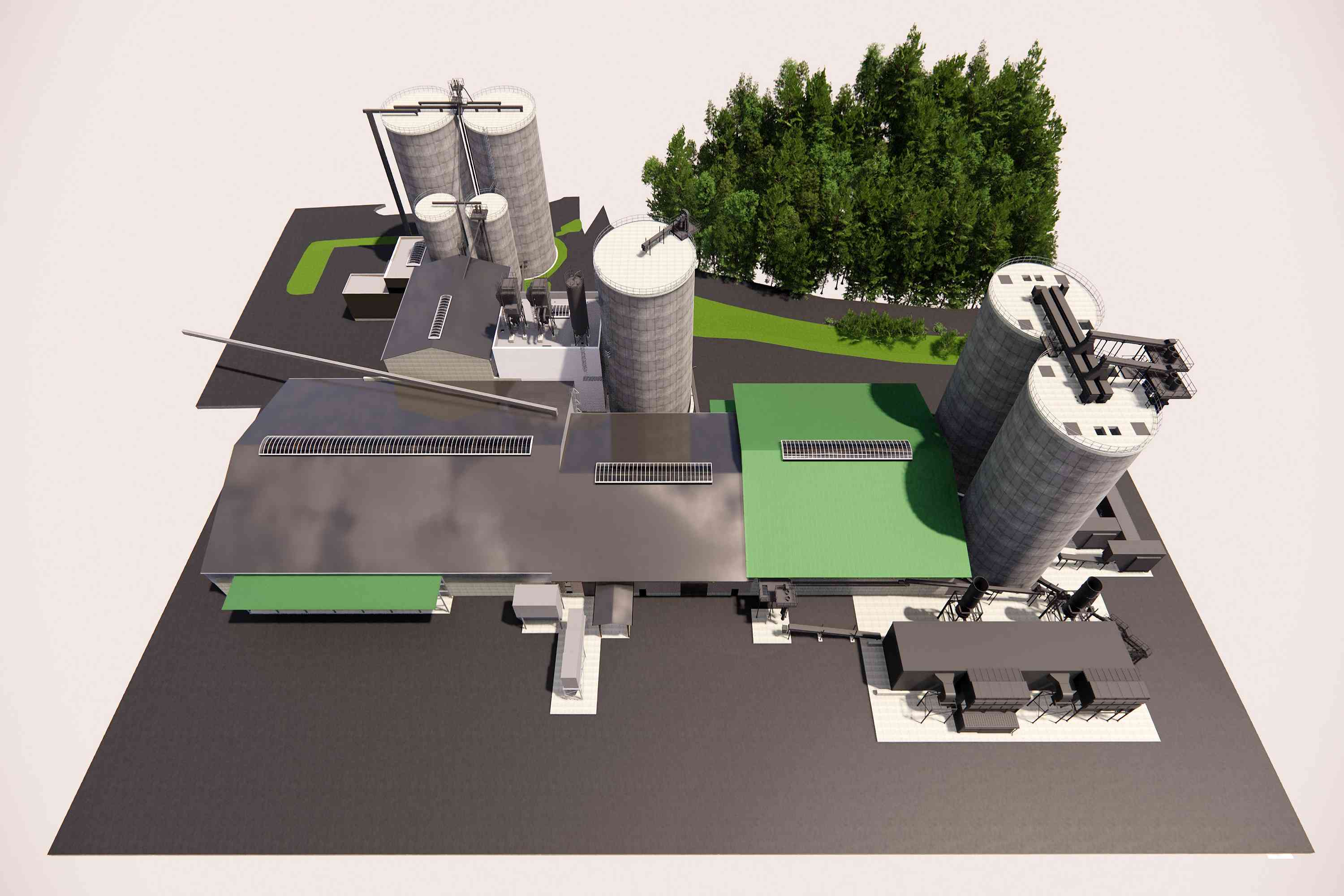 Die Baumaßnahmen umfassen zudem den Zubau einer neuen Pelletsproduktion auf der Nordseite der bestehenden Pelletsproduktion 1 und den Neubau einer neuen Kleinverpackung auf der Süd-. bzw. Ostseite der bestehenden Pelletssilos. Im Zuge der Arbeiten wird die bestehende Kleinverpackung inkl. Maschinentechnik bis auf die Fundamentierung komplett abgebrochen und durch das neue Gebäude ersetzt.
